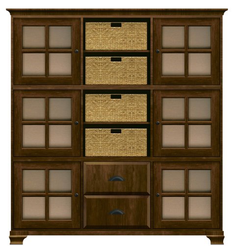 #Howard Miller 930-001PS001K -Personal Storage Cabinet. -Made from hardwood and veneers. -Available in several finishes. -Hardware: knobs on doors and cup pulls on drawers. -Two doors with plain glass and four doors with inset panels. -One cross storage shelf with four woven baskets. -Six adjustable interior shelves. -Cove profile top and ogee profile base. -Features soft-close doors,metal drawer glides, and metal shelf clips. -Ships in three cartons. -Some assembly required. -Overall Dimensions: 78" H x 73.5" W x 17" D.