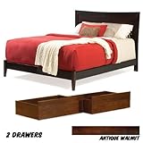 | ✚✚✚ Miami Platform Bed Queen with Open Foot Rail with 2 Flat Panel Bed Drawers (Antique Walnut) (47.25"H x 63.75"W x 84.00"D) The Miami Platform Bed Queen with Open Foot Rail in Antique Walnut by Atlantic Furniture boasts a sleek, contemporary feel with its slightly concave arch and flat-panel design headboard. Bold, modern styling and an eye-catching finish complete the modern look. The Miami is capable be set high, perfect to accommodate flat panel storage drawers, or set low, for the popular platform bed look. The Miami is constructed of solid, eco-friendly hardwood with solid hardwood bed slats, making the well-crafted Miami strong, reliable, and easy to assemble. Built to last and and perfect for any decor! Assembly level/degree of difficulty: Easy.