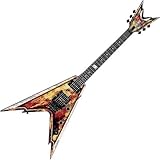 | ✚✚✚ Dean Razorback V Guitar 25.5 Scale Explosion with Case The Dean Razorback V 255 electric guitar features a mahogany neck and body and a rosewood fretboard. The V-shape neck has a strong, set joint and a 1-5/8" nut. Grover tuners and a locking tremolo keep you in perfect tune while you divebomb the night away. 24 fast frets facilitate wicked, shredding solos and lightning quick chord changes. USA Dean DMT "DimeTime"/Dimebucker pickups provide plenty of molten tones. 3-way switching, volume and tone control keep things simple, yet tonally flexible, and with tons of presence.Being a Dean guitar, the Razorback V 255 looks as good as it sounds. Dangerous-looking edges are highlighted by color-contrast bevels on the body and outlines on the famous Dean headstock. V inlays with Dime's razorblade at the twelfth fret plus all black hardware make this guitar wickedly stunning.Dimebag Darrell Abbott's return to Dean Guitars was one of the many things cut far too short by his death near the end of 2004, but his many drawings and ideas have kept the guitar makers at Dean inspired. These Razorback V 255s were some of Darrell's final designs, and we're sure they will inspire you, too!.