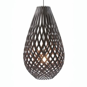 David Trubridge Design Koura Pendant - Stained?Design by David Trubridge.Made in New Zealand, by David Trubridge Design.Koura is the Maori name for the small fresh water shrimps that live in New Zealand rivers. Koura, the light, is inspired by the woven baskets used to catch the shrimps.A new world mix of old world skills and craftsmanship, sustainability of materials and purity combined with some high-tech genius. Using timber from sustainably managed plantations, all pieces are designed to use the minimum amount of material for the maximum amount of effect.Koura is made from bamboo plywood with a stained black finish. Ships flat packed with excellent instructions for self-assembly. The kitset packaging helps minimize impact on the environment. Ships with 6 feet of wire and a canopy.