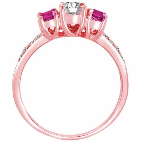 18K Rose Gold Round 3 Stone Diamond and Pink Sapphire Ring With Pave Set Shank (0.95 ctw) Size 4 1/