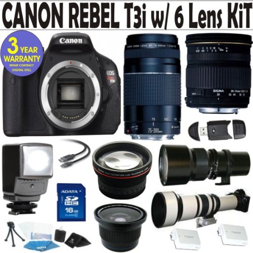 Canon Rebel T3i - Canon EF 75-300mm f/4-5.6 III Telephoto Zoom Lens - 500mm Preset Lens - 650-1300mm Super Telephoto Lens - .40x Fisheye Lens - 2.2x Telephoto Lens - 16 GIG Memory Card Sigma 28-70 F2.8-4 DG Lens: is digitally optimized diagonal fisheye lens uses an aspherical lens element for excellent correction of distortion and is equipped with a new multi-layer coating technology that reduces both flare and ghosting. This lens is great low light lens, and ideal for traveling, landscape photography and general photography. Canon EF 75-300mm f/4-5.6 III Telephoto Zoom Lens: An economical DC motor driven AF zoom, with the same optical system, construction, and exterior as its USM sister model. 500mm Preset Lens - 650-1300mm Super Telephoto Zoom Lens - .40x Fisheye Lens - Vivitar 2.2x Telephot Lens - 16GB High Speed Memory Card - Video LED Light - HDMI Cable - Memory Card Reader - Two Rechargeable Lithium-ion Replacement Battery Packs - 6 Piece Lens & Care Cleaning Kit 3 Year Celltime Warranty